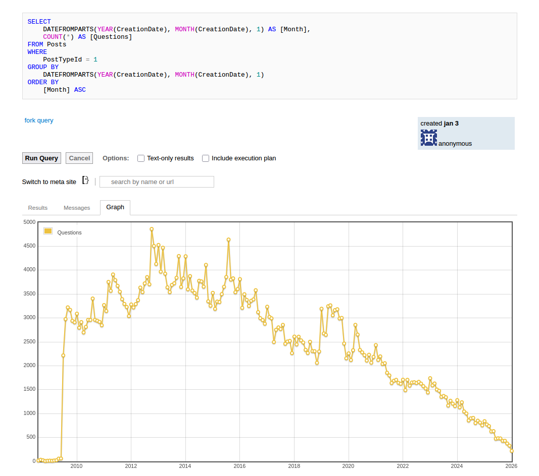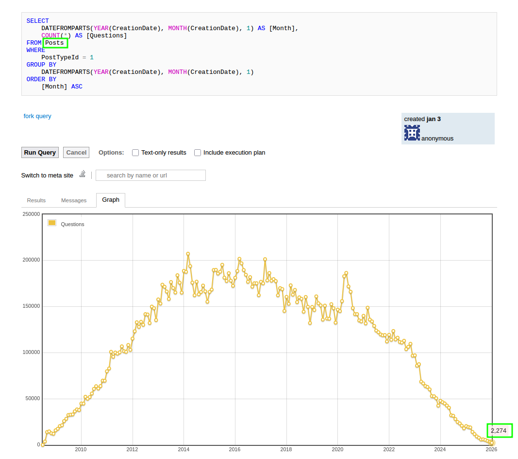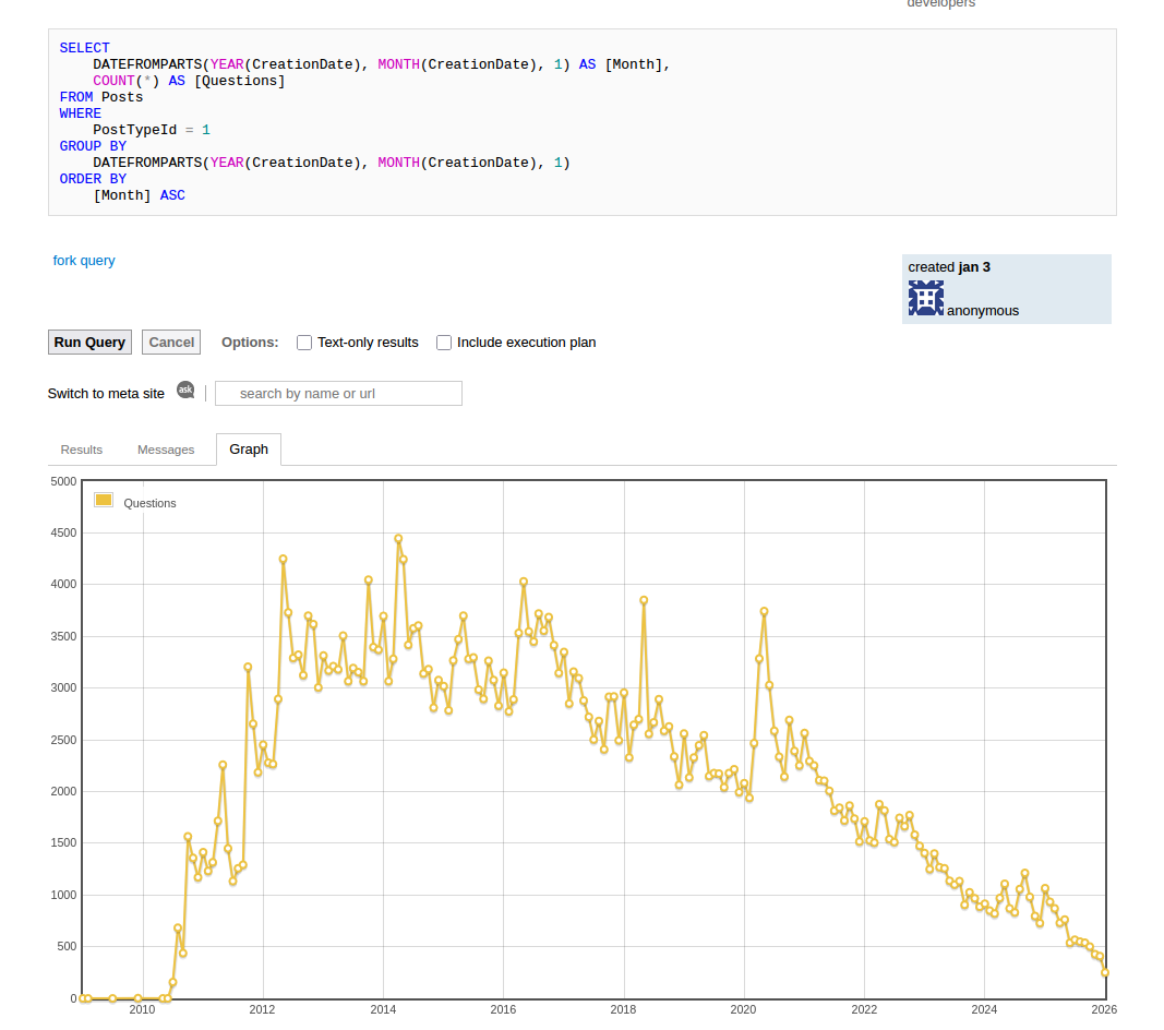I have been seeing a number of articles and discussions regarding the decline of Stack Overflow posting activity over the past year. My immediate first thought was around the value that the question-answer dataset holds, and what would happen if it were to be shut down, or its vast repository of questions and answers rendered inaccessible; would it be prudent to start taking backups of the data, not just for archival purposes but for continued access to its highly valuable knowledgebase?