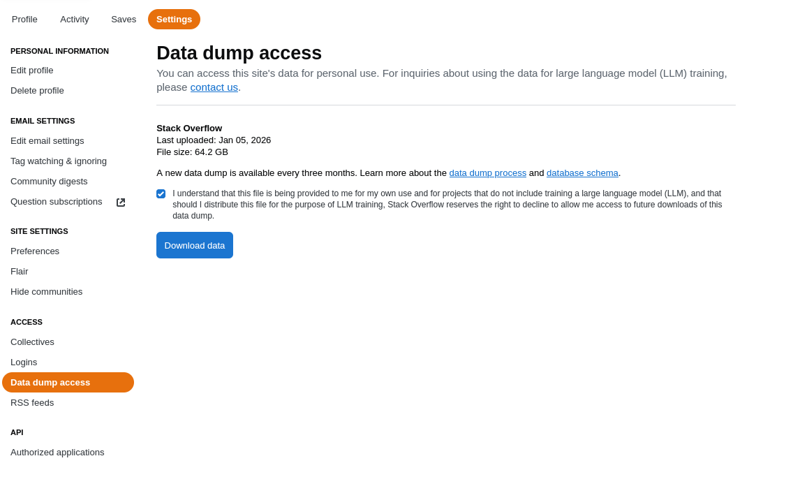 They used to post data dumps to archive.org, but in 2023 briefly cancelled the data dump, reinstated it after backlash, then cancelled and moved the data dumps behind user authentication in 2024, while also discouraging archive.org reuploads.