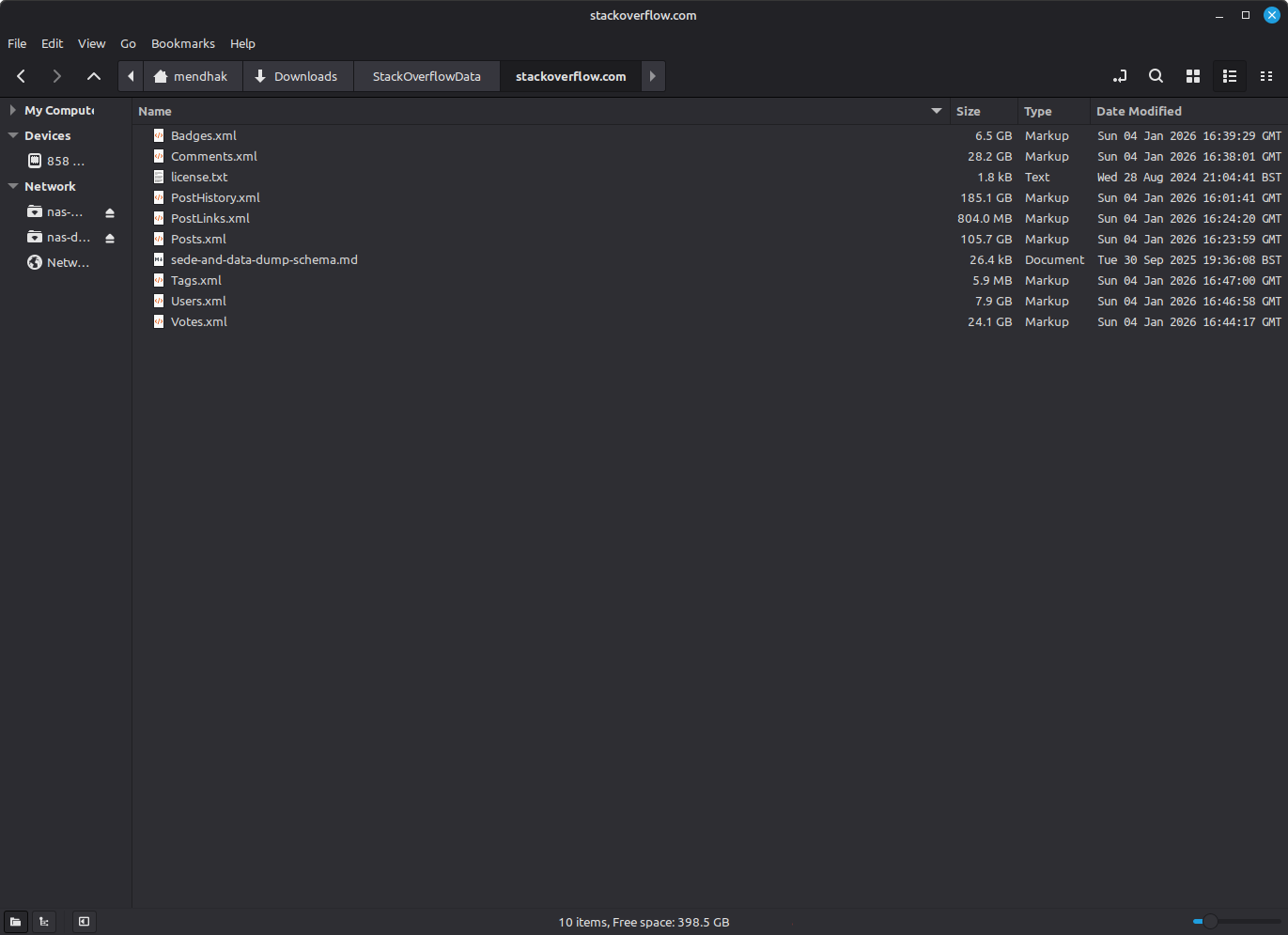 Given the years and volumes of accumulated questions and answers, I was a little surprised to find that the entire Stack Overflow data dump was just ~70 GB compressed. Each table is stored in the archive as an XML file, each element representing a row in the table. Each Stack Exchange network site has its own data dump, but follows the same schema which means that the learnings from one site can be applied to the others. I feel it worth praising the simplicity of the design of these sites and their reusability.
