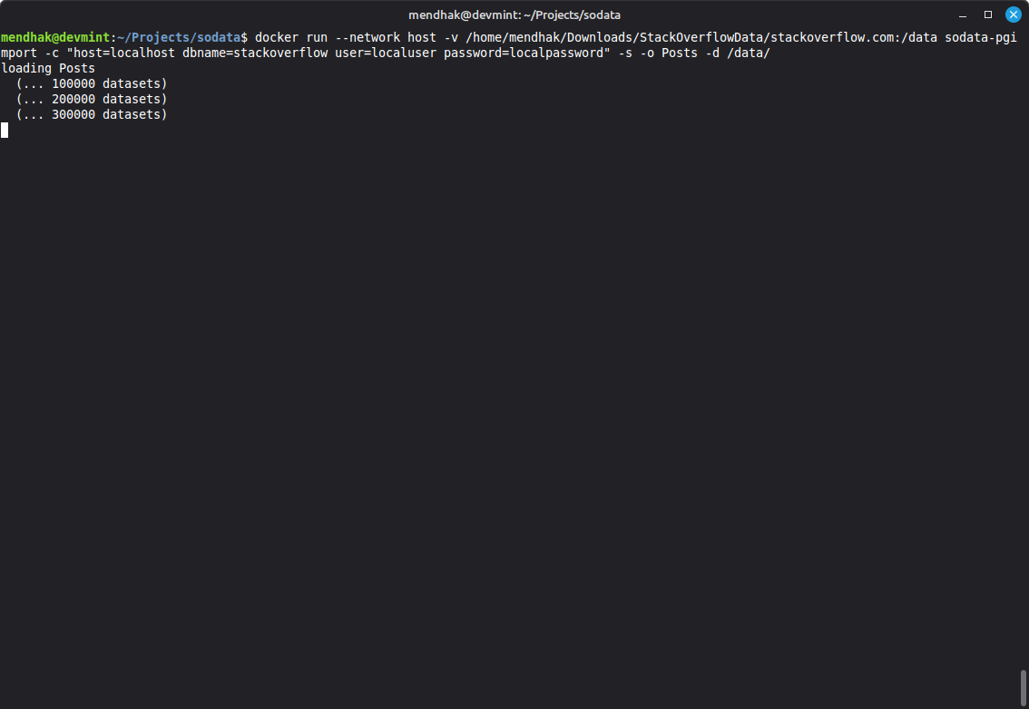 docker run --network host -v /home/mendhak/Downloads/StackOverflowData/stackoverflow.com:/data sodata-pgimport -c "host=localhost dbname=stackoverflow user=localuser password=localpassword" -o Posts -I
