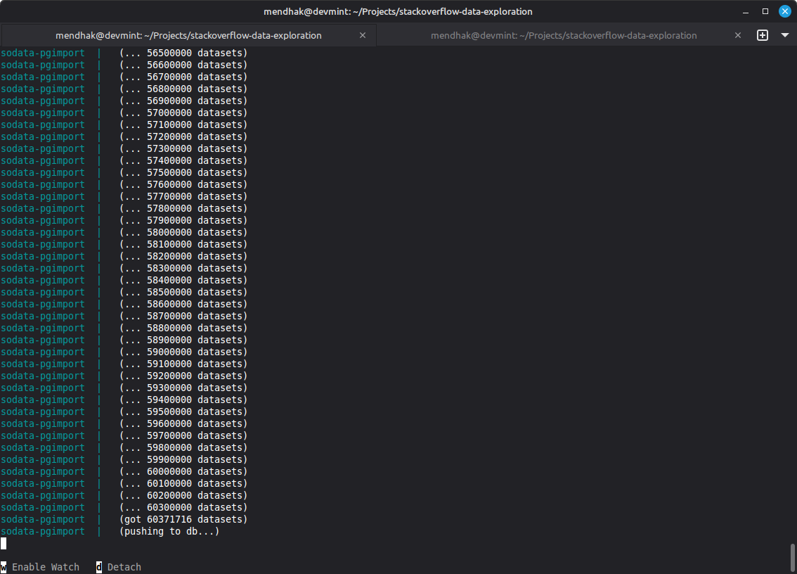 The --network host makes use of some clever Linux networking, so that the pgimport container could connect to the Postgres instance. The /data folder is mounted in both containers, and maps to the location where the Stack Overflow data dump XML files are stored. The -o Posts indicates that I only want to import the Posts.xml file, and the -I indicates that I want to create indexes after the import. The way the tool works is that it first converts the XML into a CSV file, and then uses Postgres’ COPY command to bulk load the data.