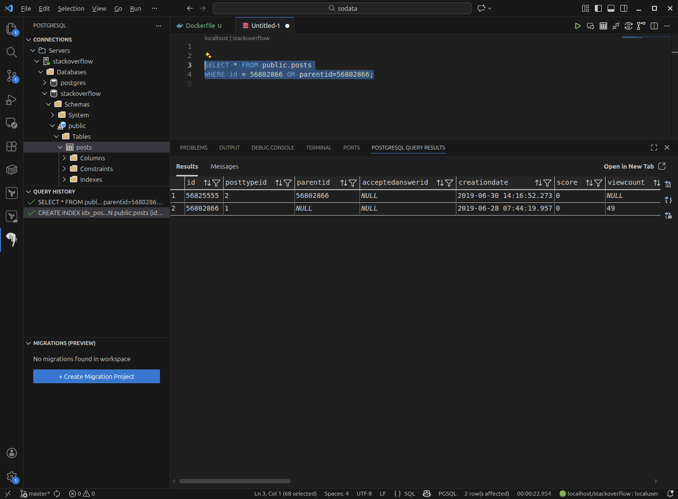 Once the import was complete, I connected to the Postgres instance and created an index on the id column of the posts table, to speed up lookups.