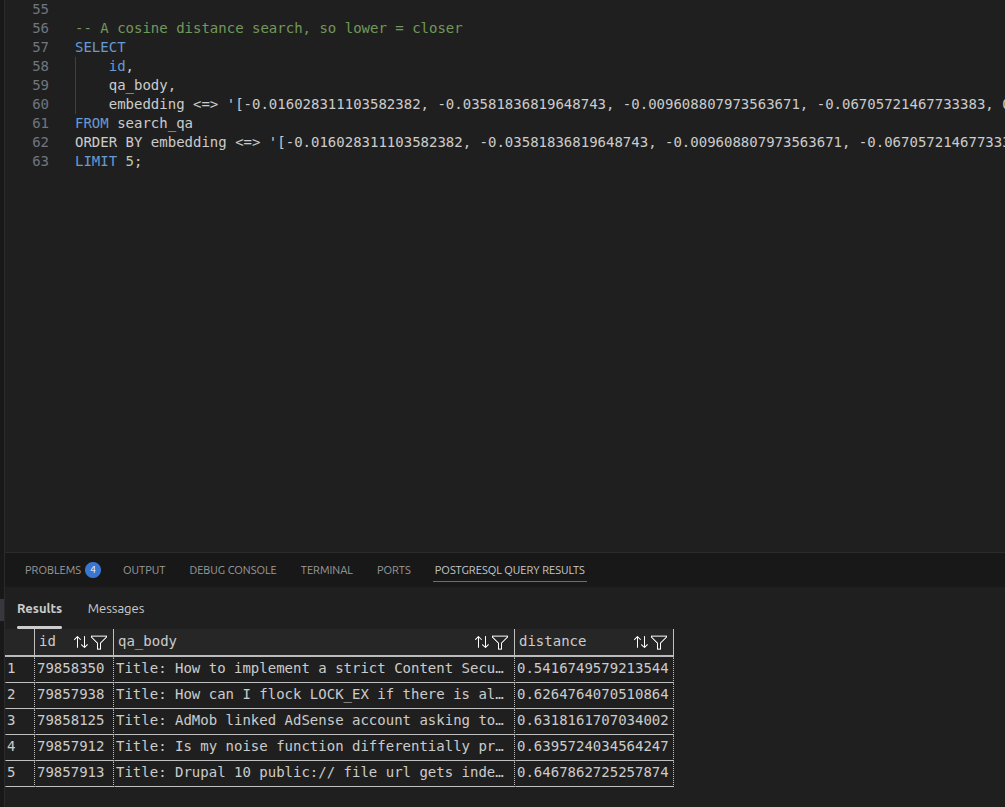 I then did a quick test search, I generated the embedding for the phrase “Content Security Policy”, and did a vector similarity search over the search_qa table.